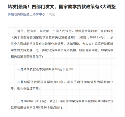 《关于调整完善国家助学贷款有关政策的通知》由教育部、财政部、中国人民银行、银保监会等四部门联合印发,主要从三个方面对助学贷款有关政策作出调整:第一,助学贷款还本限期从3年延长至5年;第二,助学贷款期限从学制加13年、最长不超过20年调整为学制加15年、最长不超过22年;第三,2020年1月1日起,新签订合同的助学贷款按照同期同档次贷款市场报价利率(LPR)减30个基点执行。我院勤工助学中心落实国家政策的一些系列举措,使学生对如何办好生源地贷款有了进一步认识,受到广大学子的一致好评。
