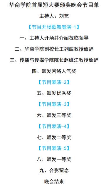 本网讯:华商学院首届短视频大赛颁奖晚会将于9月23日晚7时隆重举行。华商学院“首届短视频大赛”正式落下帷幕,为表彰华商首届短视频大赛获奖学生,进一步提升学生专业实践积极性,由华商学院主办、教务处和传播与传媒学院共同承办的华商学院首届短视频大赛颁奖晚会将于9月23日(周三)晚7时在华商学院图书馆报告厅隆重举行,届时,将揭晓本次大赛各奖项获奖作品,同时,还有精彩的文艺演出贯穿其中。华商学院校领导代表、教务处领导代表、传播与传媒学院领导及各系主任、教职工代表将出席本次活动。传播与传媒学院新媒体中心将对本次晚会进行网络视频转播和图文直播。