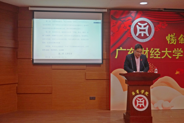 校友办主任黄国富宣读《广东财经大学华商学院人文学部校友会章程(草案)》,并由大会表决通过;主持人李旭伟宣读广东财经大学华商学院人文学部校友会第一届理事会理事、顾问、会长、副会长、秘书长、副秘书长提名名单,并由大会表决通过。