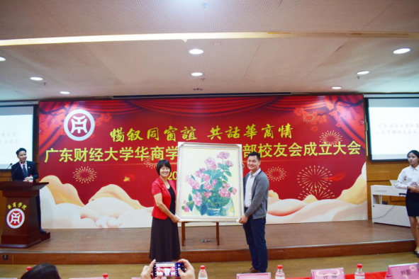 校友代表古文胜、刘秋梓、张晓媚分别向母校赠送《硕果累累》、《百花齐放》、《厚德载物》等纪念品,祝愿母校各项事业蒸蒸日上,为社会培养出更多优秀人才。