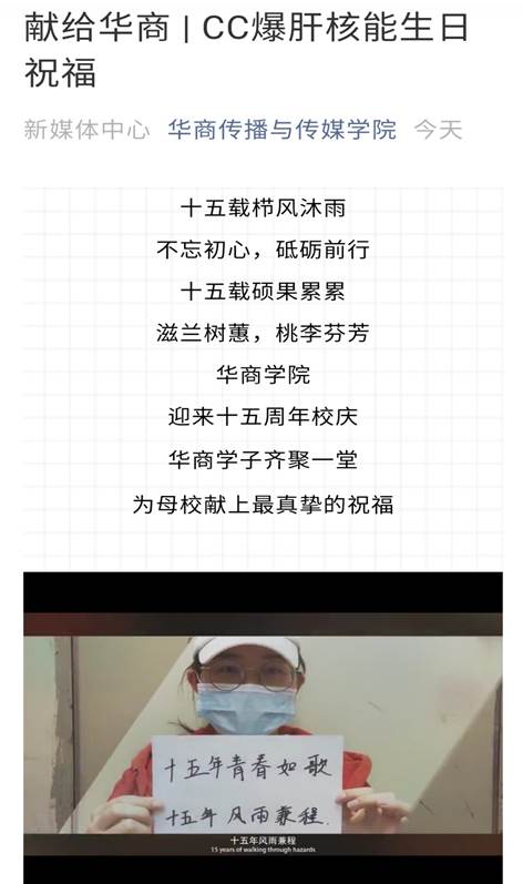 本网讯:传播与传媒学院新媒体中心B站制作祝福短片献礼华商十五华诞。为庆祝广州华商学院成立十五周年,传播与传媒学院新媒体中心各平台通力合作,拍摄并制作祝福短片,为校庆活动加油助力。祝福短片已于24日在传院新媒体中心各大平台上线。