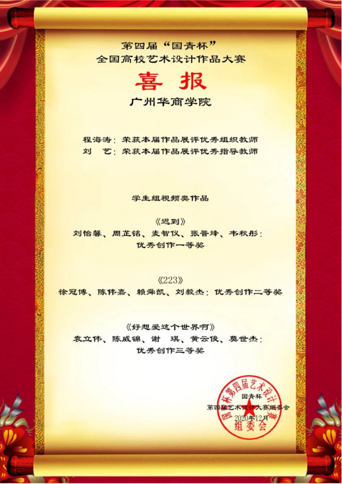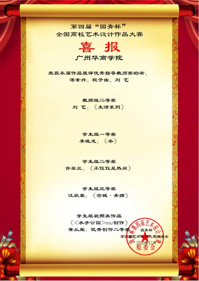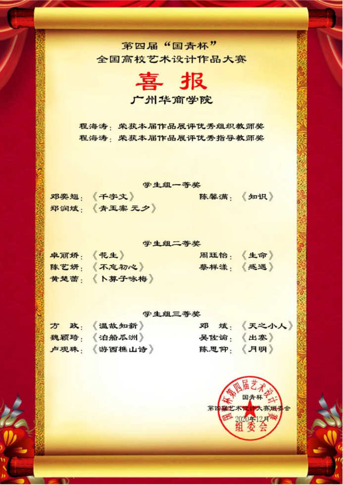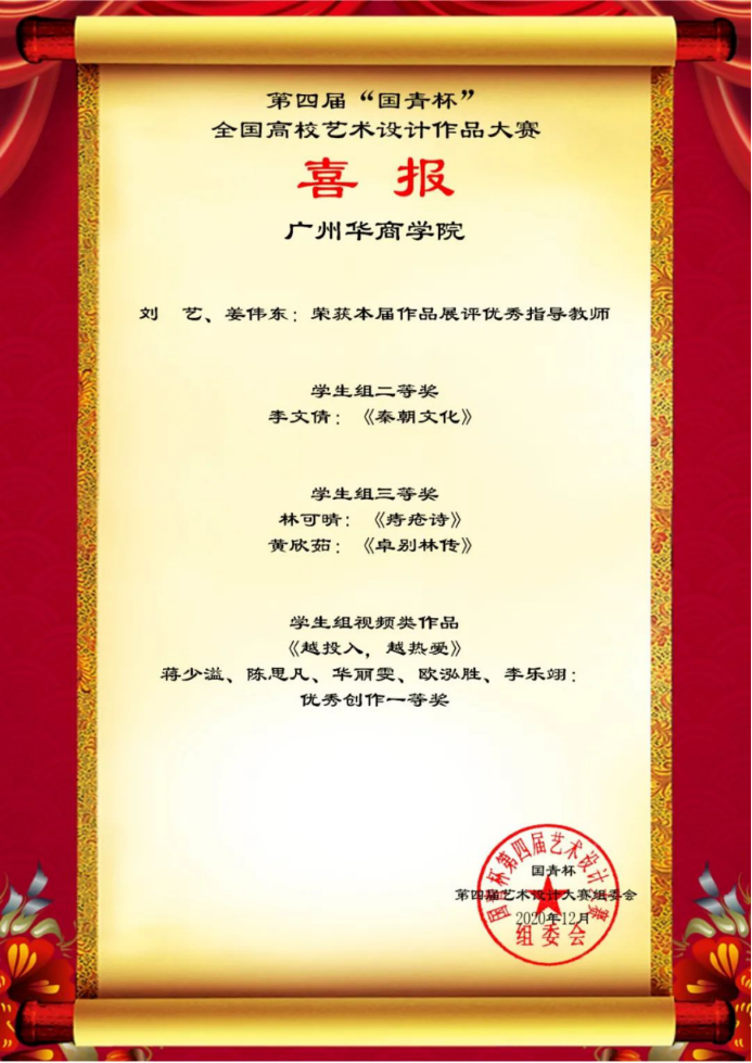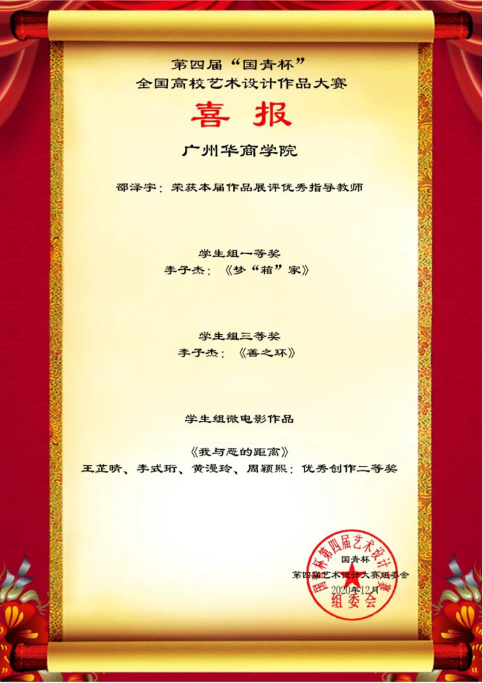 2020年12月23日,第四届“国青杯”全国高校艺术设计作品大赛落下帷幕,传播与传媒学院、创意设计学院师生在本届比赛中喜获佳绩。李子杰等15名同学创作的《梦“箱”家》等7项作品荣获学生组一等奖;王芷晴等16名同学创作的《我与恶的距离》等10项作品荣获学生组二等奖;袁立伟等15名同学创作的《好像爱这个世界啊》等11项作品荣获学生组三等奖;刘艺老师的作品《生活系列》荣获教师组二等奖。邵泽宇、刘艺、姜伟东、程海涛等老师荣获优秀指导老师奖;程海涛老师荣获优秀组织教师奖。