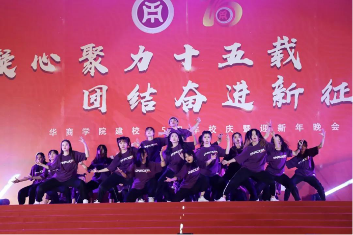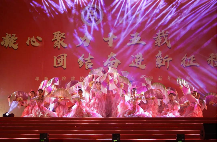 校舞蹈队、舞蹈志愿者带来的舞蹈《颂华商》正式拉开了今天晚会的表演序幕,整齐并富有朝气活力的舞姿,瞬间点燃了全场气氛,牢牢地抓住了每个人的眼球。