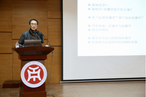 会议第二项议程,由传播与传媒学院名誉院长谭天教授作主题发言。谭天教授首先结合自身对新闻传播学科发展的思考,提出新闻传播学发展要“走出传播学”,从新闻传播学转变为传播学与传媒学,推动跨学科研究发展。