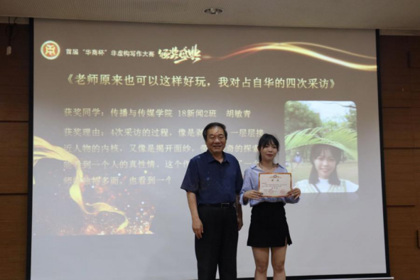 特等奖获得者为18新闻2班的胡敏青同学,赵维江院长负责为其颁奖,奖金为1000元。