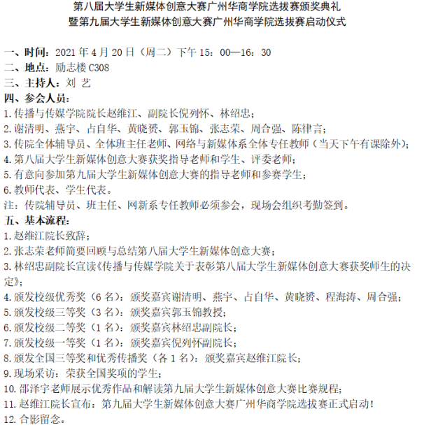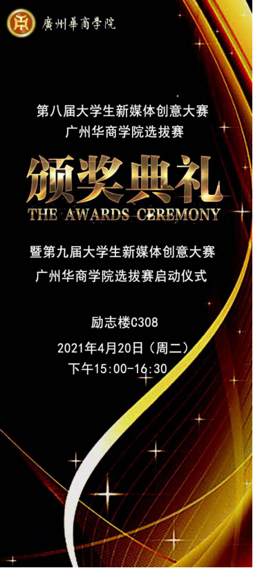 经过半年多的精心策划、认真组织、严格评审,传播与传媒学院主办的“第八届大学生新媒体创意大赛广州华商学院选拔赛”,顺利落下帷幕,本次大赛共选出11件校级优秀作品代表我校参加全国评比。为贯彻学院实践教学方针,鼓励学生积极参加专业实践比赛,传播与传媒学院将于4月20日下午15点至16点30分在励志C308隆重举办第八届大学生新媒体创意大赛广州华商学院选拔赛颁奖典礼暨第九届大学生新媒体创意大赛广州华商学院选拔赛启动仪式。届时将揭晓本次大赛各类奖项,并对获奖学生和老师进行表彰。大会还将启动第九届赛事,并现场解读参赛规则。传播与传媒学院新媒体中心官方微博及B站平台将对本次典礼做现场直播,敬请关注!