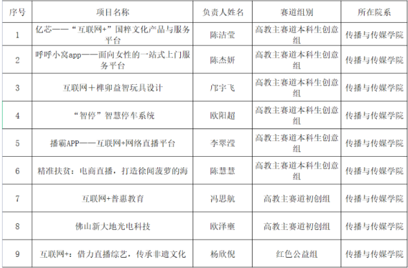 本网讯:传播与传媒学院9个参赛项目入围第七届“互联网+”大学生创新创业大赛华商学院选拔赛决赛。6月14日,广州华商学院创新创业学院公布入围第七届中国国际“互联网+”大学生创新创业大赛华商学院选拔赛决赛项目团队名单,我院共有9组参赛项目晋级校级决赛,位居全校第一,创我院参赛以来最好成绩,全校共有34组项目晋级决赛,决赛将于6月19日在线上和启智楼402同步举行。