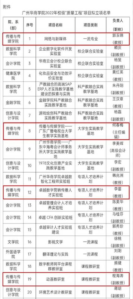 本网讯:传播与传媒学院获立2022年校级项目8项。7月6日,我校公布了2022年校级“质量工程”建设项目立项名单、广州华商学院2022年创新创业教育专项研究课题立项名单,传播与传媒学院共有8项项目获得立项,包括一流专业、高等教育教学改革项目、大学生实验教学基地、专项人才培养计划、课程教研室、创新创业教育专项研究等。