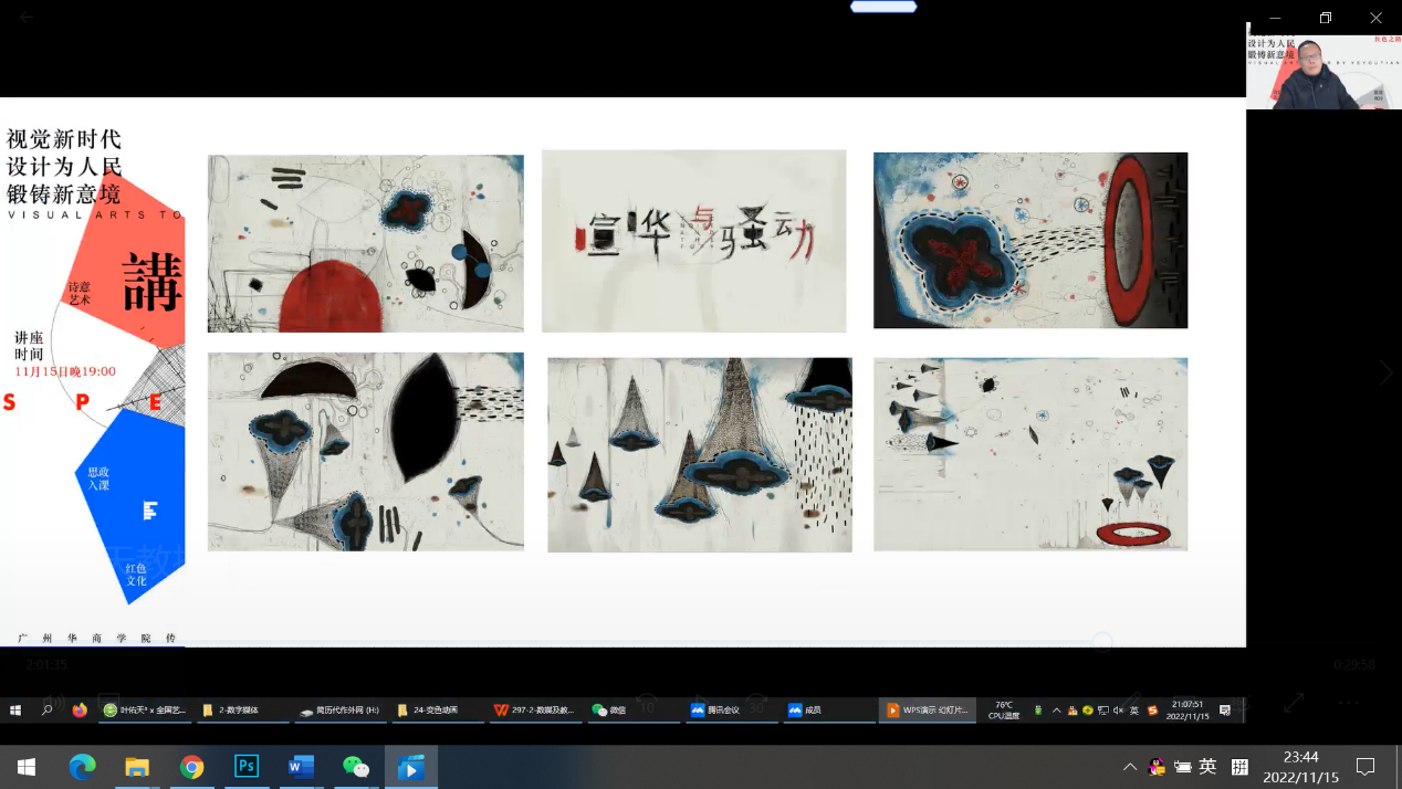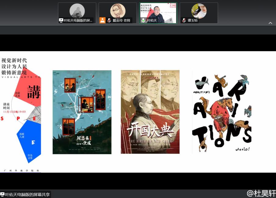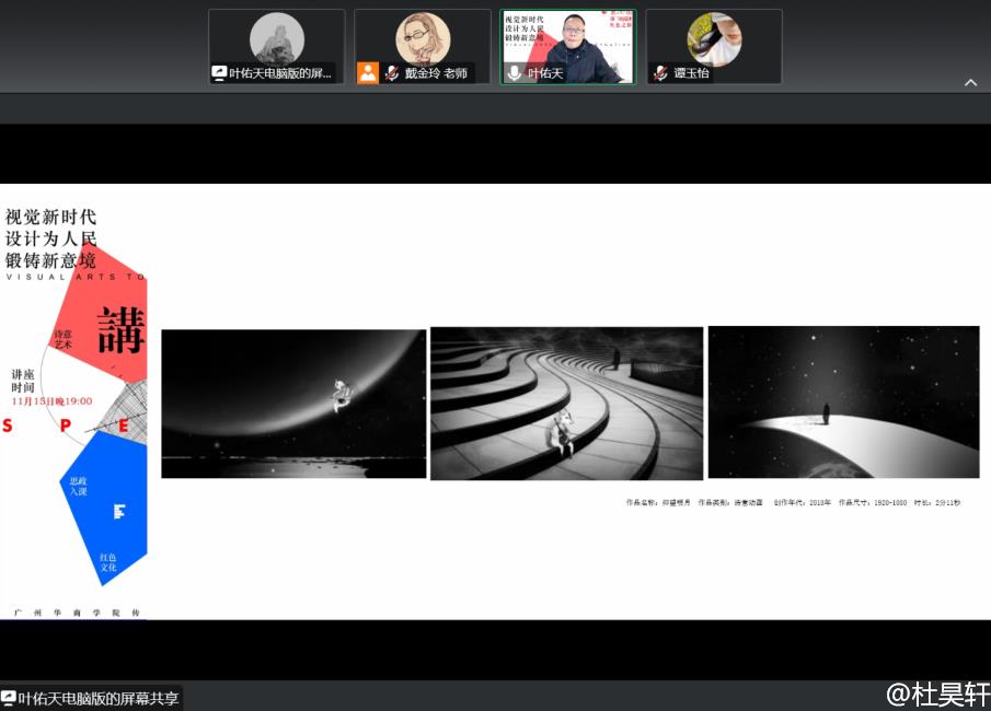 2022年11月15日19:00,传播与传媒学院网络与视频系邀请湖北美术学院叶佑天教授,开展主题为《“视觉新时代:设计为人民+锻铸新意境”》的学术讲座。视频系副主任戴金玲副教授是本次会议的主持人。因为疫情防控原因,本次讲座为线上形式,讲座总参与人数达到腾讯会议上限300人。