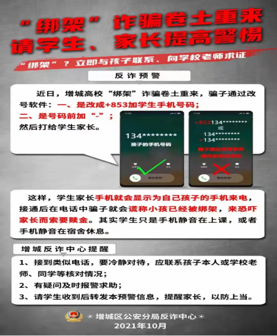 一、与家长做好必要的沟通。各类诈骗事件的发生,除了贪小便宜、幻想“天上掉馅饼”外,缺少与家长、老师的沟通是重要原因。以这波“绑架”案来说,基本上被骗家长都是没有收到学生本人的提醒信息的,而这些辅导员老师、班级干部都是多次提醒。因而,希望全体同学必须将近期“绑架”诈骗屡发的详细情况告知家长,提醒家长提高警惕,做好防范。