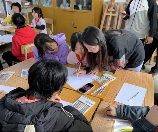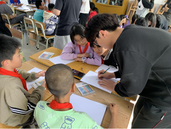 华商师生们与红军小学学生们进行绘画辅导和交流,积极地给予孩子们鼓励与引导。
