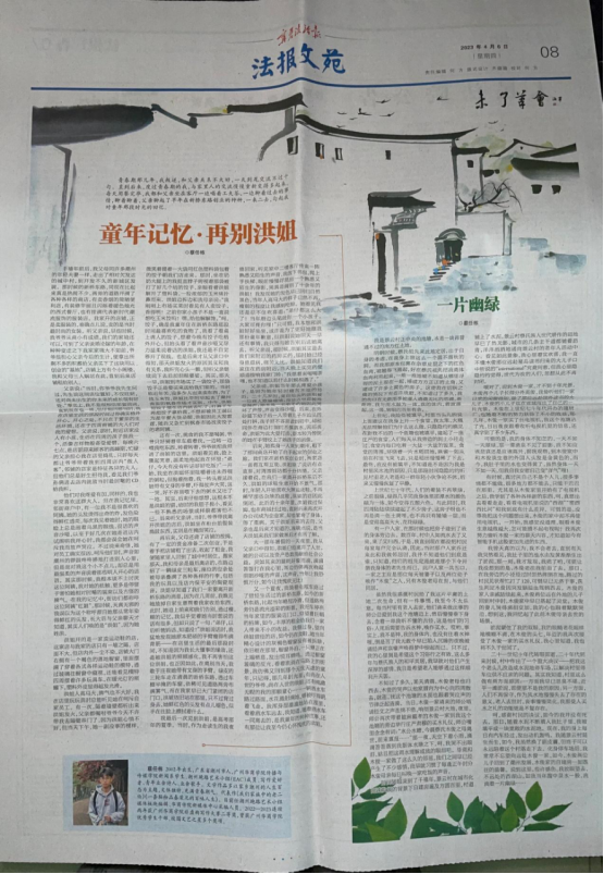 4月6日,传播与传媒学院21本新闻1班学生蔡任栋的两篇文学作品《再别洪姐》《一片幽绿》在《宁夏法治报》“未了笔会”以整版版面刊登。一人两篇作品同时在省级党报上刊登,这在传播与传媒学院历史上尚属首次。