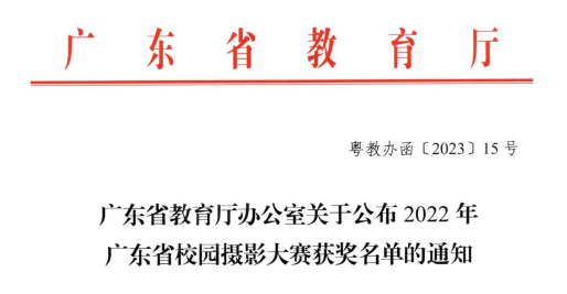 2023年4月19日,2022年广东省校园摄影大赛获奖名单正式公布,传播与传媒学院学子在此次大赛中喜获佳绩。林海萍同学荣获高校学生组一等奖(我院程海涛老师指导);方子卓同学荣获高校学生组三等奖。