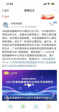 10月28日上午9时,2023年县级融媒体中心创优与发展研究高端论坛在增城宾馆隆重举行。本次论坛由中国社会科学院新媒体研究中心和广州华商学院共同主办,浙江省安吉县融媒体中心、《中国记者》杂志社和《媒体融合新观察》杂志社协办,传播与传媒学院新媒体中心承担本次高端论坛的传播工作。