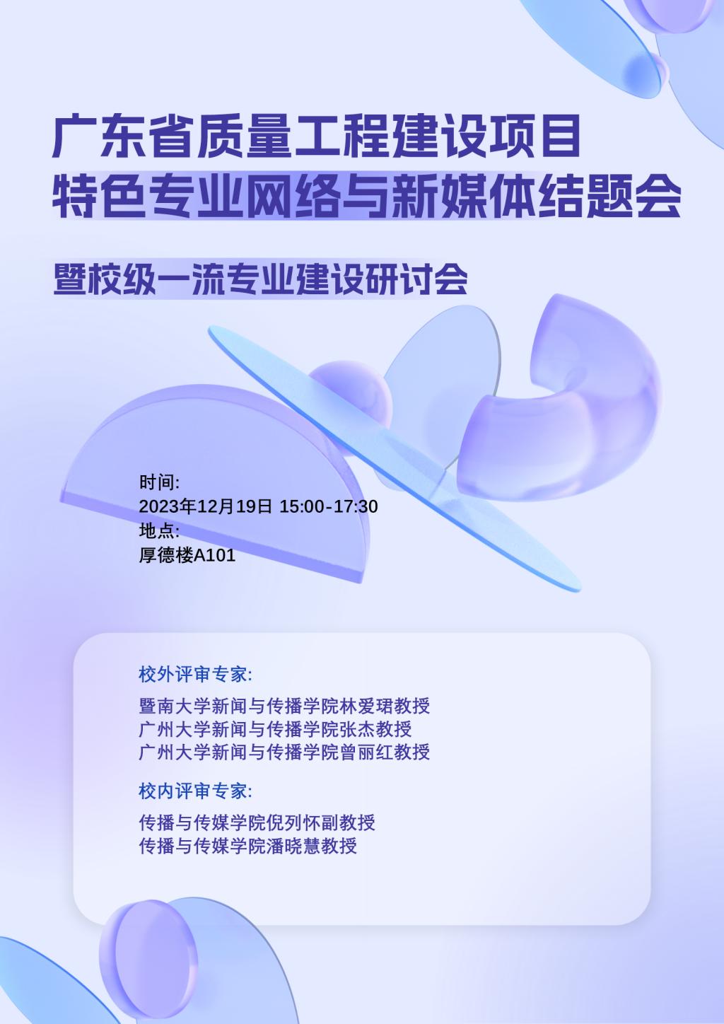 自2017年5月以来,传播与传媒学院网络与新媒体专业已走过不寻常的六年半,为盘点网络与新媒体专业所取得的各项成果,反思在发展过程中还存在的问题,更好规划发展方向和更加精准专业定位,按照省教育厅和学校教务处2020年广东省质量工程结题时间安排,兹定于12月19日下午3点在厚德楼A101召开“广东省质量工程建设项目特色专业网络与新媒体结题会暨校级一流专业建设研讨会”。本次活动邀请暨南大学新闻与传播学院林爱珺教授、广州大学新闻与传播学院张杰教授、曾丽红教授担任校外评审专家,邀请广州华商学院传播与传媒学院倪列怀副教授、潘晓慧教授担任校内评审专家。欢迎光临指导!