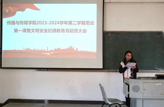2024年3月12日下午,传播与传媒学院在励志楼B204召开2024学年文明安全纪律教育月动员大会暨思政第一课。出席会议的有传播与传媒学院院长张晋升、传播与传媒学院党委副书记谢清明、辅导员王洁、王铃蓉以及21级各班班长、团支书、学委、纪委。