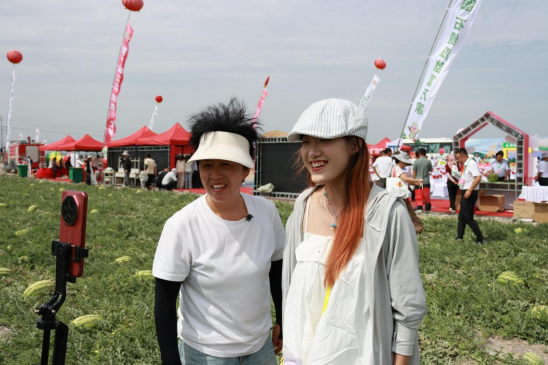 “中卫硒砂瓜,瓜中至尊宝,认准官方中字标!”现场,自媒体达人“宁夏丹丹”架起设备,热热闹闹开启直播推介,广州华商学院数字传播学院院长张晋升、副院长王健、22本广告学1班学生缪雯菲看到后,也走进她的直播间为中卫硒砂瓜倾情推荐。