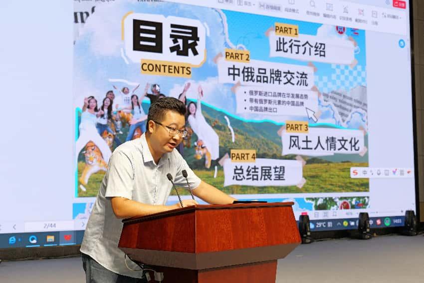 宋金绪老师作为“华商行天下”宁夏实践队代表首先进行汇报,他汇报的主题为“塞上江南·神奇宁夏”,涵盖调研行程、实践成果、学生收获与教学反思四大部分。他在最后总结说,本次实践以“特色产业+生态治理+文化传播”为主线,通过沉浸式调研,让学生触摸宁夏“黄河富庶”与“人进沙退”的双重奇迹,输出传播成果与产业建议,更反向推动教学反思——唯有将课堂扎根土地,方能培养真正“懂传播、懂中国”的应用型人才。