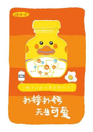 该平面针对娃哈哈钙多多&锌多多的萌趣包装,融合趣味小游戏的元素,更显童真。通过简短有力的文案“小鸭子的肚子里面有什么”、“小老虎的肚子里面有什么”,既符合孩子们的喜好,也激发孩子们对产品的好奇心,吸引他们饮用的欲望。整体画面采用粗糙蜡笔画形式,色彩鲜艳,突出产品卖点,让消费者感受到其营养均衡、自带“萌”属性的产品魅力。