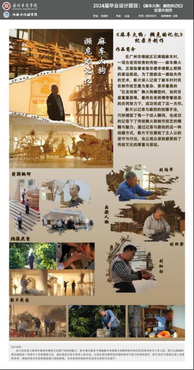 设计阐述:本片旨在深入探索并展现非物质文化遗产的独特魅力,影片镜头聚焦于增城麻车传统舞火狗模型制作技艺的这项传统手工艺上面。影片以细腻的镜头捕捉这一传统手工艺的精湛之处,通过真实记录与传承人的互动,让观众深切感受到非遗的鲜活气息与传承的艰辛。影片旨在引领观众深入非遗的世界,体验传统文化的厚重底蕴与深远影响,从而更加珍视和传承这些宝贵的文化遗产。