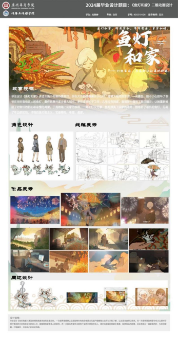 设计阐述:毕业设计《鱼灯和家》通过亲情的角度来宣传非遗文化,一方面希望能够让这项即将失传的非物质文化遗产能够被大众所认识和了解,让这项非遗得以传承。另一方面希望仍然留守在大山里村子里守着这种古老传统文化的老人们,能够拥有更多亲人的陪伴。再一方面也希望外出到各个城市打拼的年轻人,偶尔也能够回到家乡看看,即使再远的距离,总会有那么一盏家里的灯,为你们留着。灯燃家在,不忘初心和来时的路。