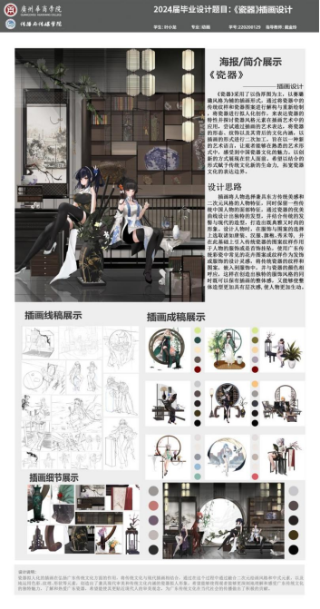 设计阐述:瓷器拟人化的插画在弘扬广东传统文化方面的作用,将传统文化与现代插画相结合,通过在这个过程中通过融合二次元绘画风格和中式元素,以及地运用色彩、纹理、形状等元素,创造出了兼县现代审美和传统文化内涵的瓷器拟人形象。希望能够使得观者能够更深刻地理解和感受广东传统文化的独特魅力,了解和热爱广东瓷器,希望能使其更贴近现代人的审美观念,为广东传统文化在当代社会的传播做出了积极的贡献。