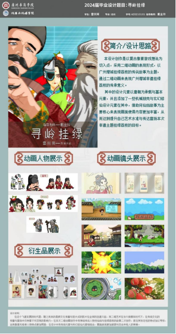 设计阐述:在这个飞速发展的时代里,随之而来的是跨文化传播与短片式的影片在全球的迅速兴起,而二维艺术在当今新媒体时代下,在传统文化的传播与宣扬中仍有着不可忽视的影响力。在本次二维动画创作中将神话传说人物何仙姑与挂绿荔枝的故事二次创作,抓住其标志性的特点加以夸张,运用像素风格使人物特点更加明显,在设计中将传统元素与科幻修仙元素相结合,画面表现更加新颖与符合年轻人的审美。