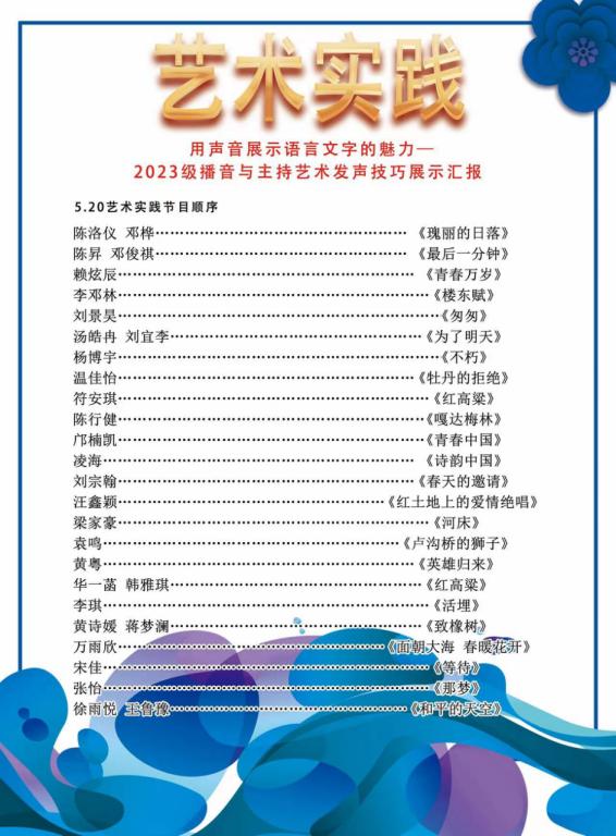 2024年5月20日晚,传播与传媒学院口语传播系在肇庆校区八号楼108课堂开展艺术实践周“中华经典诵读”的主题活动。口语传播系主任孙胜利老师、专业负责人李华老师、专任教师夏梦君老师以及23级播音与主持艺术全体学生参加了本次活动,活动由口语传播系学生马慧玟、肖博文、邹潇晴、张富成主持。