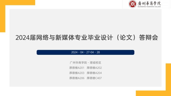 为落实广州华商学院本科评估工作要求,夯实毕业设计(论文)工作全流程,提升人才培养质量,2024427日至28日,传播与传媒学院网络与新媒体系本科毕业设计(论文)答辩会在厚德楼A201-206举行,网络与新媒体系全体教师和2024届网络与新媒体专业毕业生参加答辩会。