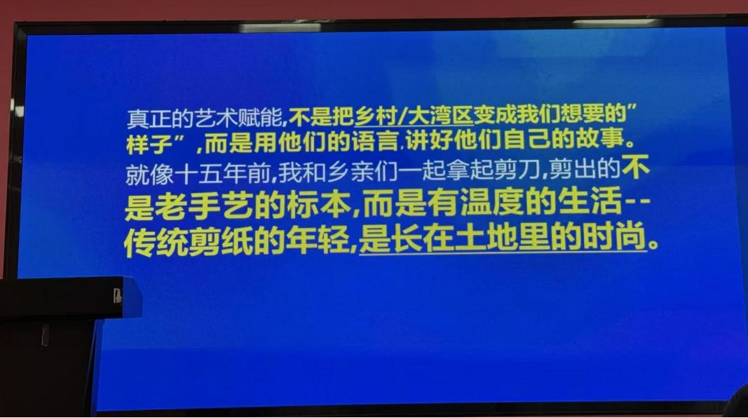 十五五开局,乡村仍需发展,文旅发展与乡村振兴正当时,国家在发展,乡村在路上;文旅赋能乡村,动画与数媒服务大湾区人民。艺术不分中外,如同做人,不忘传统、扎稳根基,作品才有文化、灵魂与审美。真正的艺术赋能,不是把乡村、大湾区变成我们想要的“样子”,而是用他们的语言,讲好他们自己的故事。就像十五年前,我和乡亲们一起拿起剪刀,剪出的不是老手艺的标本,而是有温度的生活——传统剪纸的年轻,是长在土地里的时尚。他没有枯燥地罗列理论,而是结合自己丰富的求学、创作与执教经历,生动阐述了在日新月异的时代背景下,如何契合“十五五”时期数字赋能乡村文化振兴及大湾区文化协同发展的政策要求。